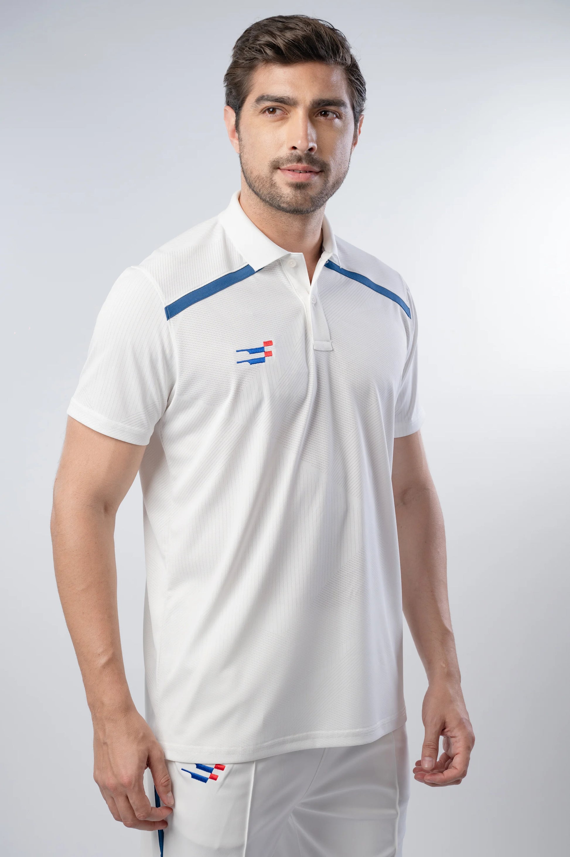 The Bouncer Cricket Whites T-Shirtfeatures 100% mesh jacquard polyester for superior airflow, lightweight comfort, and quick-dry match performance — built to keep you cool, dry, and focused through every over.